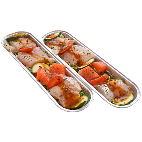 Een bootje met daar in een gezellige opmaak van verschillende soorten vis; kabeljauw/ zalm/scholfilet en panga op een bedje van verse groente en besprenkeld met een heerlijke marinade. -knoflook -Grieks; kruidig -Indisch; licht pikant.