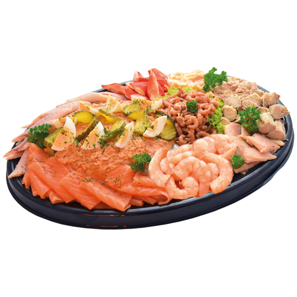 Huisgemaakte zalmsalade, gerookte zalm, gerookte paling, Hollandse garnalen, gerookte, gerookte makreel, gerookte forel, jumbo garnalen, krabstukjes, tonijnsalade en krabsalade. Deze schotel word mooi voor u opgemaakt en feestelijk afgegarneerd.